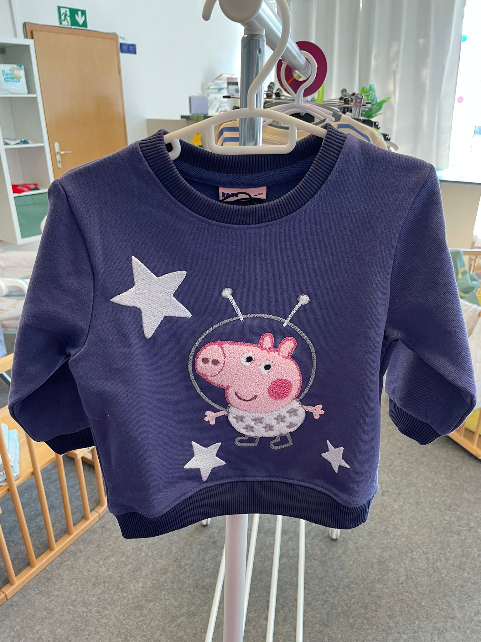 Mit dem "George Wutz Space – Sweater“ in Lila können kleine Entdecker stilvoll in die Weiten des Weltalls abheben. Das süße Design zeigt Peppas kleinen Bruder George in einem Astronautenanzug, umgeben von Sternen, was sofort die Fantasie anregt. Hergestellt aus 100% weicher, GOTS-zertifizierter Baumwolle, bietet der Pullover nicht nur hervorragenden Tragekomfort, sondern ist auch nachhaltig und umweltfreundlich. Perfekt für jeden Tag und ein Must-Have für alle Peppa Wutz-Fans, die das Abenteuer lieben!